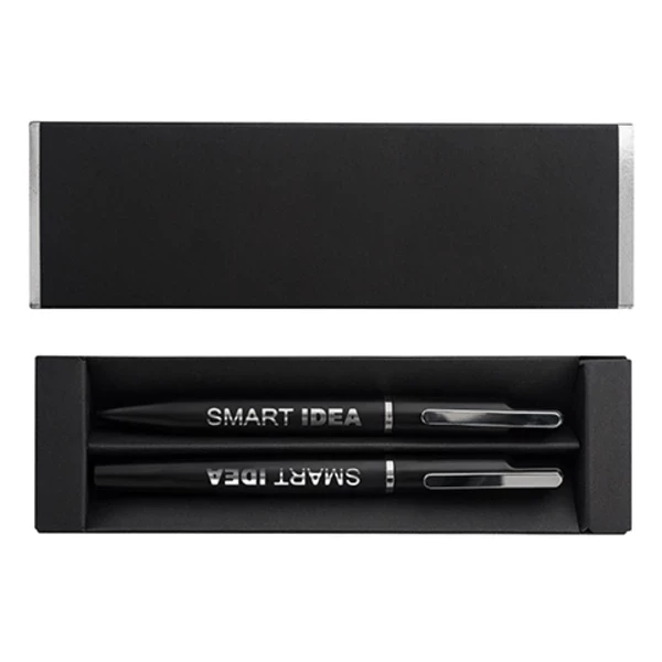 zestaw upominkowy składający się z metalowego długopisu i pióra kulkowego. Możliwość wygrawerowania błyszczącego logo, pasującego kolorem do metalowych detali długopisu.